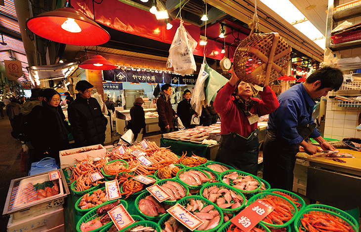 This local favorite—affectionately known as "the people's pantry"—has supported Kanazawa's culinary culture for almost 300 years. All sorts of goods are displayed at more than 170 storefronts along the market's narrow streets, which are filled with sounds of energetic buying and selling.